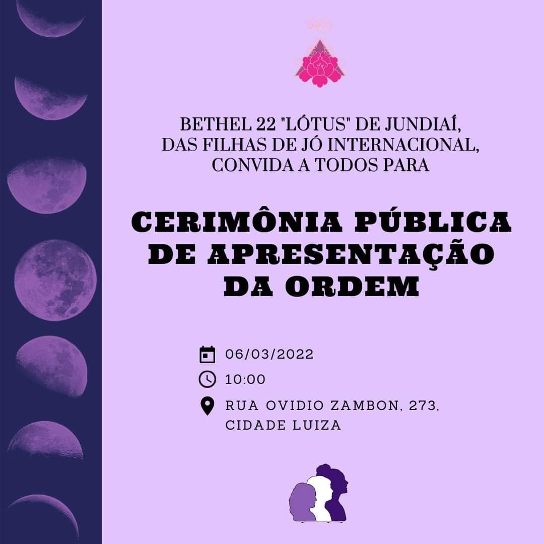 O BETHEL 22 LÓTUS DE JUNDIAÍ faz parte da ORDEM DAS FILHAS DE JÓ INTERNACIONAL, uma entidade paramaçônica voltada para meninas entre 10 e 20 anos que tenham parentesco maçônico. No próximo dia 6 de março de 2022, domingo, no horário das 10 hs, o Bethel irá realizar uma Sessão Pública de Divulgação da Ordem, aberta para todos os Maçons e convidados, e que tenham filhas entre 10 e 20 anos incompletos, sendo que a candidata não precisa ter parentesco maçônico para ser admitida.