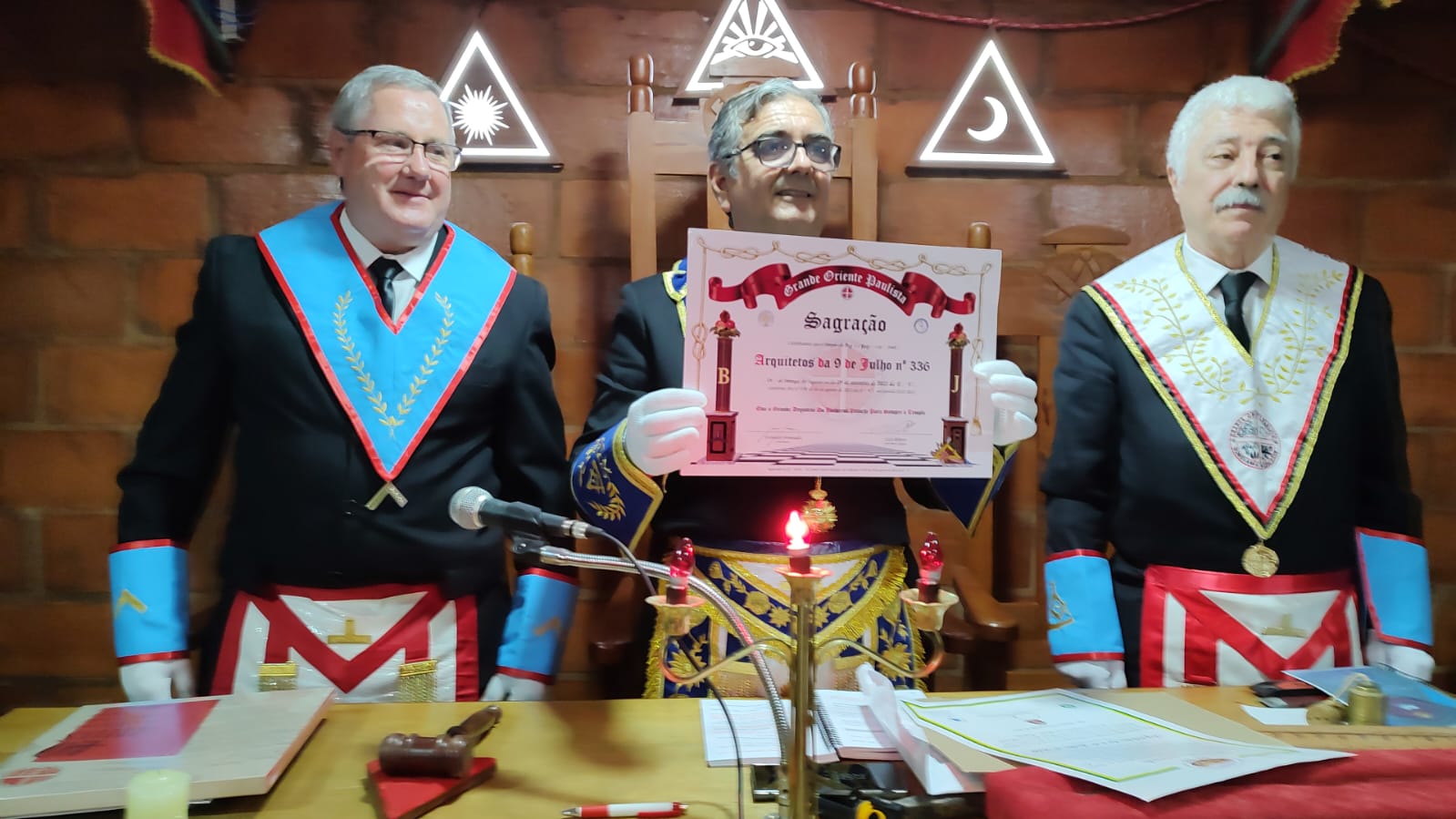 Pelo segundo dia na mesma semana o Sereníssimo Grão Mestre FERNANDO FERNANDES participou de uma Sessão de Sagração de Templo. Na segunda feira dia 05 de setembro esteve no oriente de Salto de Pirapora, onde realizou a Sagração do Templo da Loja LUZ E SABEDORIA 415. E nesta última quinta feira dia 08 de setembro, esteve no oriente de Ibitinga, onde realizou também a Sagração o Templo da Loja ARQUITETOS DA 9 DE JULHO 336, o que comprova mais uma vez o que vimos afirmando em posts anteriores, que o crescimento do Grande Oriente Paulista em número de Lojas e irmãos é constante, onde já recuperamos o número de irmãos que tínhamos antes da pandemia e já ultrapassamos aquele número.
