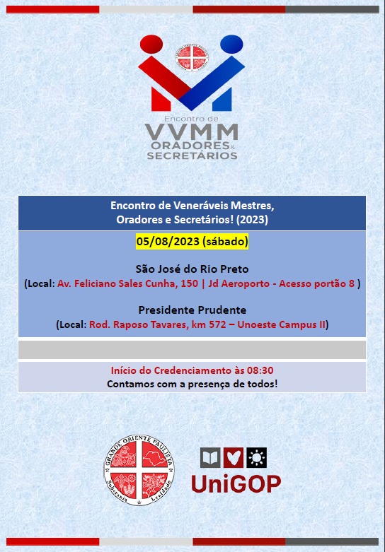Neste sábado dia 05 de agosto, a partir das 8:30 hs, o Grande Oriente Paulista realizará nos orientes de Presidente Prudente e de São José do Rio Preto, as duas primeiras edições do “Treinamento de Lideranças:  Veneráveis, Oradores e Secretários” para oferecer treinamento aos novos irmãos que assumiram estes cargos em julho, para o mandato 2023/2024. Os endereços onde serão realizados são os abaixo: