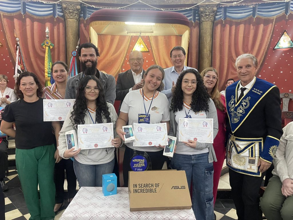 Alunos: Camila Aparecida de Oliveira, Karla Rafaelly do Nascimento Gargione e Sarah Alves Patzina. Premiação: Celular Galaxy A06 para cada aluno da equipe + Certificado + Medalha