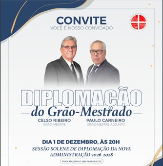 No Templo Nobre da sede do GOP os irmãos CELSO RIBEIRO e PAULO CESAR DIAS CARNEIRO serão diplomados respectivamente como Grão Mestre e Grão Mestre Adjunto, para o próximo triênio que se inicia no dia 01 de janeiro de 2026, onde farão seu juramento e receberão a respectiva diplomação.