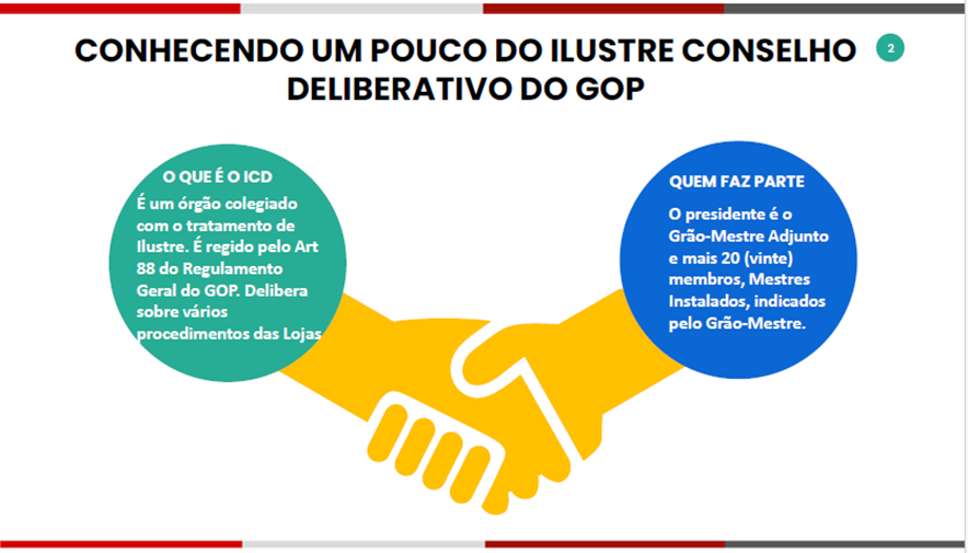 O ICD-ILUSTRE CONSELHO DELIBERATIVO é um órgão colegiado do GOP e é formado por 20 Mestres Instalados indicados pelo Grão Mestre, e o seu Presidente e quem dirige as reuniões é o Sereníssimo Grão Mestre Adjunto. Reúnem-se ordinariamente uma vez ao mês, e, extraordinariamente, quando convocado pelo Grão Mestre ou pelo Presidente do ICD.